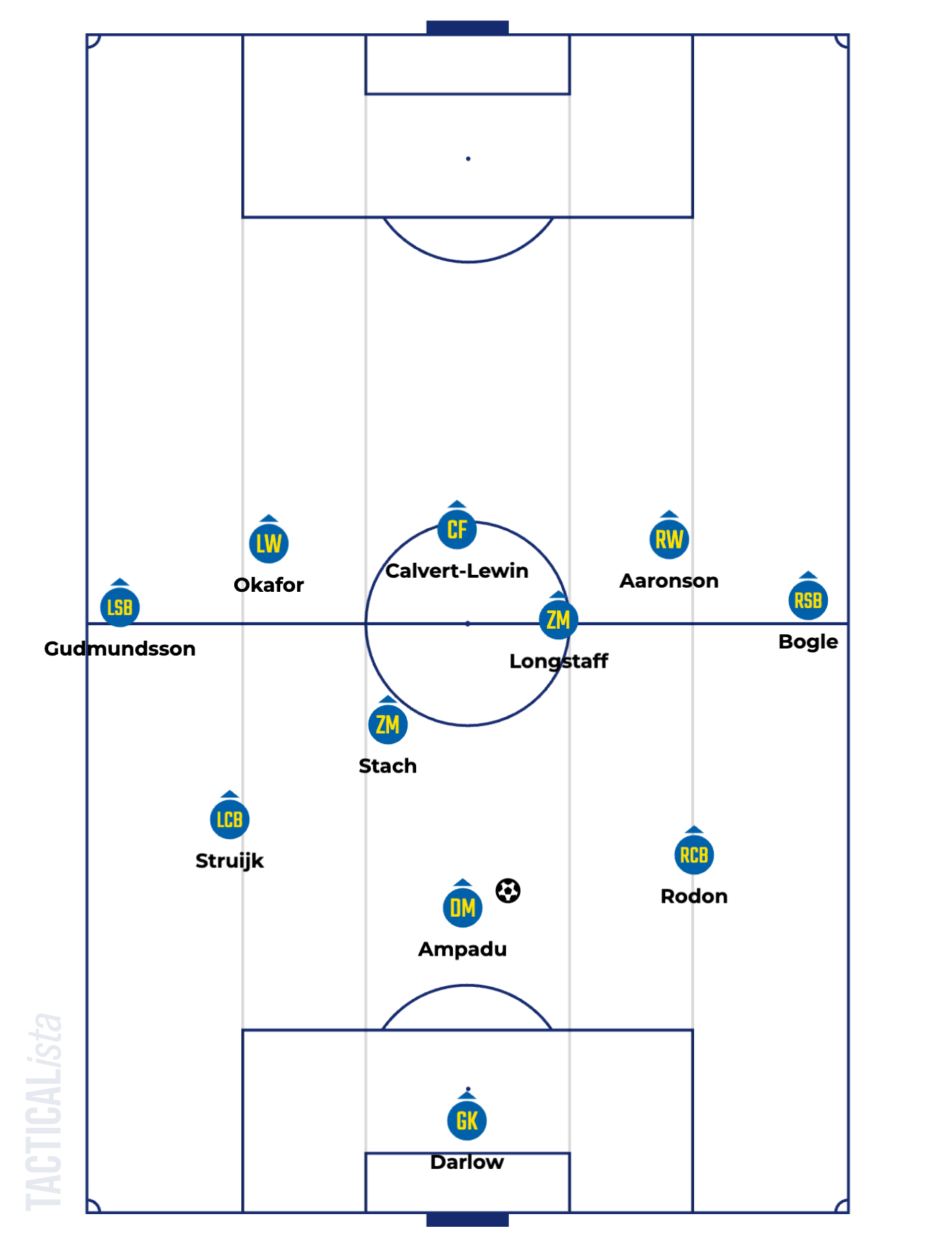 Wenn Leeds mal ruhig aufbaut, sieht man ein 3-1-6 mit Ampadu in der Mitte – klingt kompliziert, ist aber simpel. Der Waliser lässt sich zwischen die Innenverteidiger fallen, die Außenverteidiger rücken hoch. Eine Struktur, die man von vielen Top-Teams kennt.